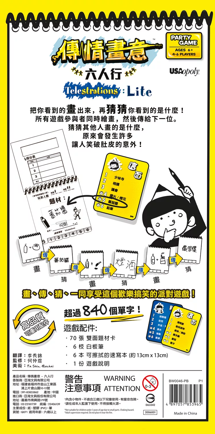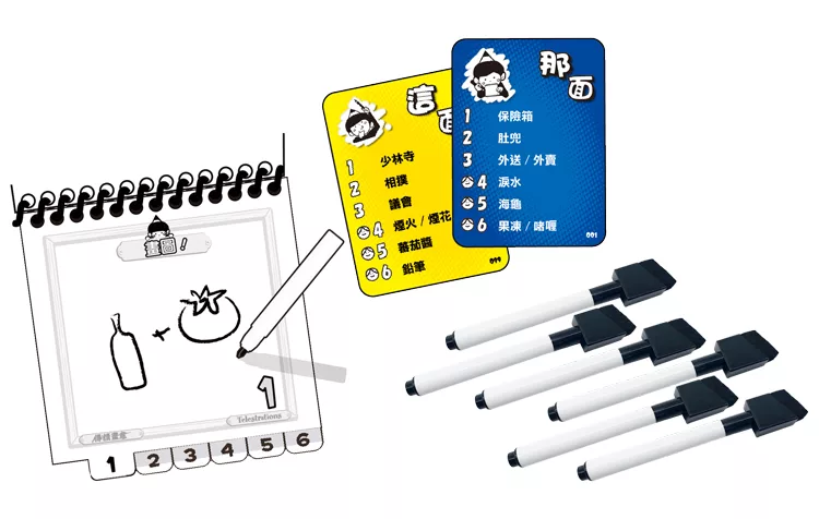 或是根據前一頁別人寫下的答案,把它畫成圖像。作畫的玩家只有60秒的時間,沙漏就是為此存在的遊戲會在速寫本傳回到玩家自己時結束。